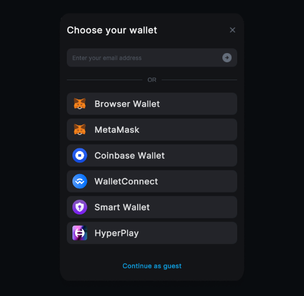 When a user clicks the button, a dropdown of supported wallets will appear. The user can then select their preferred wallet to connect to the game; once connected, the button will show the users balance and an option to switch networks if multiple networks are set up through the ThirdwebManager.